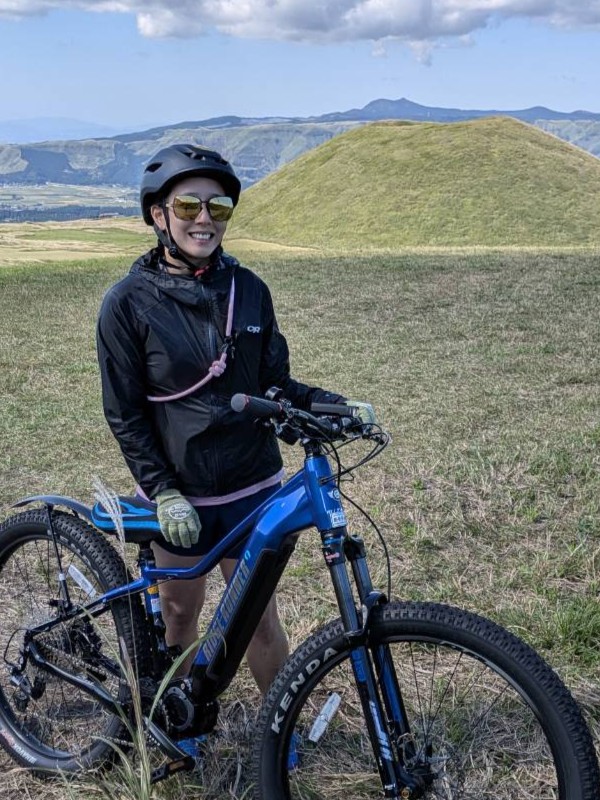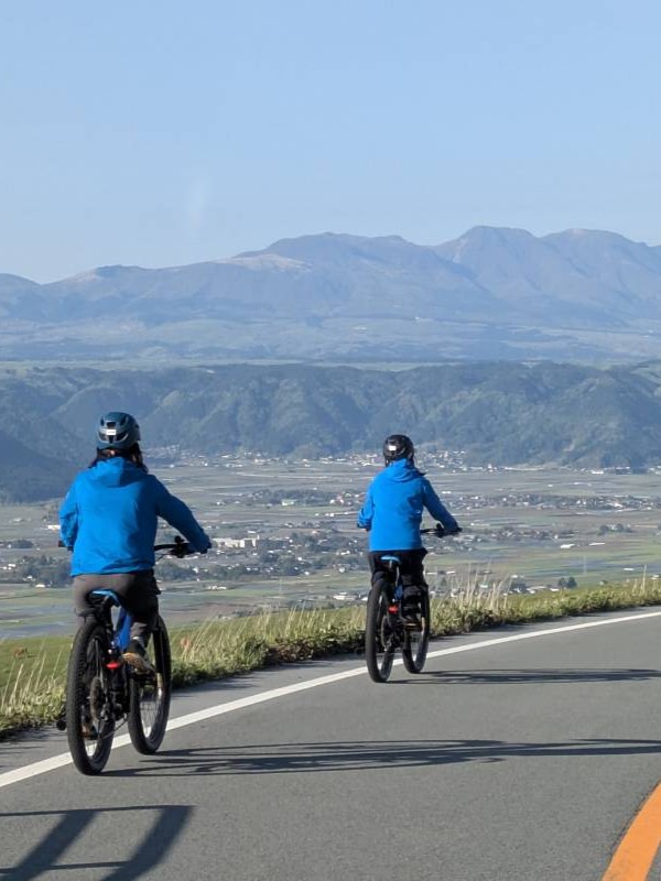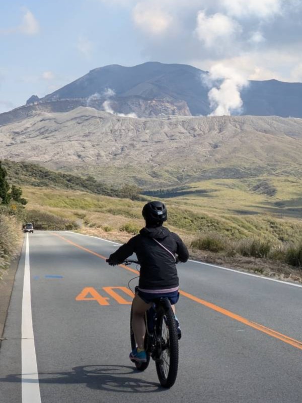 阿蘇山の麓の街「坊中」からe-Bike(電動アシスト付きマウンテンバイク)に乗って、牧野道などを登り山上の「古坊中」を目指します。中岳の噴煙や鼓動を感じながら草原ライドを楽しみます。山上から阿蘇カルデラ内に下っていく阿蘇パノラマラインが爽快です!