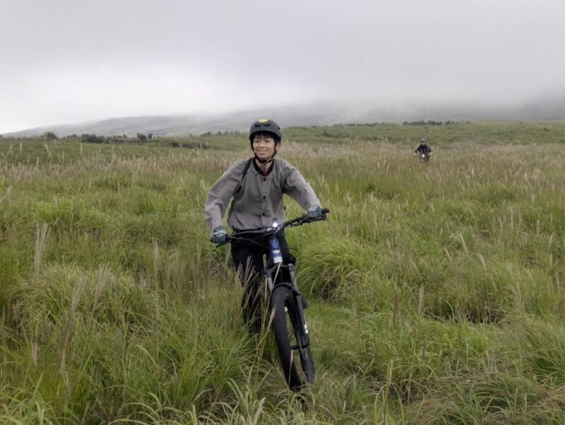 e-Bikeで阿蘇カルデラ北外輪の縁の草原を疾走!